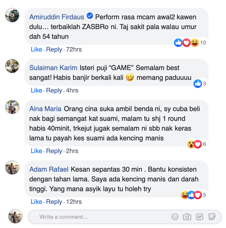 "Sebelum ni Encik Kamal ada masalah kencing manis hadapi 3 tahun masalah susah naik dan susah nak kembang lama, tapi lepas ikhtiar Zas Bro ni memang memuncak nafsu, awang